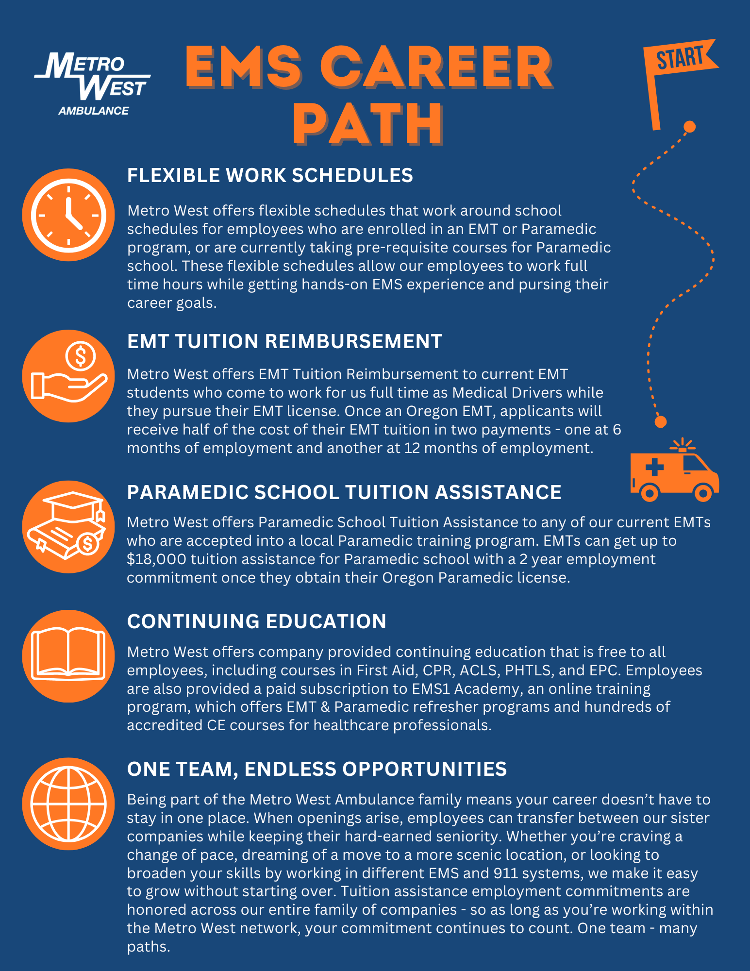 Metro West Ambulance is accredited by the Commission on Accreditation of Ambulance Services and is an equal opportunity employer. All qualified candidates will receive consideration for the position applied for without regard to race, color, religion, sex, age, national origin, disability, marital status, sexual orientation, military/veteran status, or other non-merit factors. Mero West is a drug free work place.